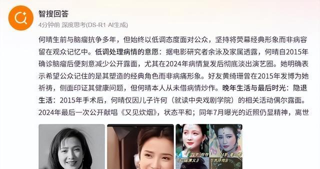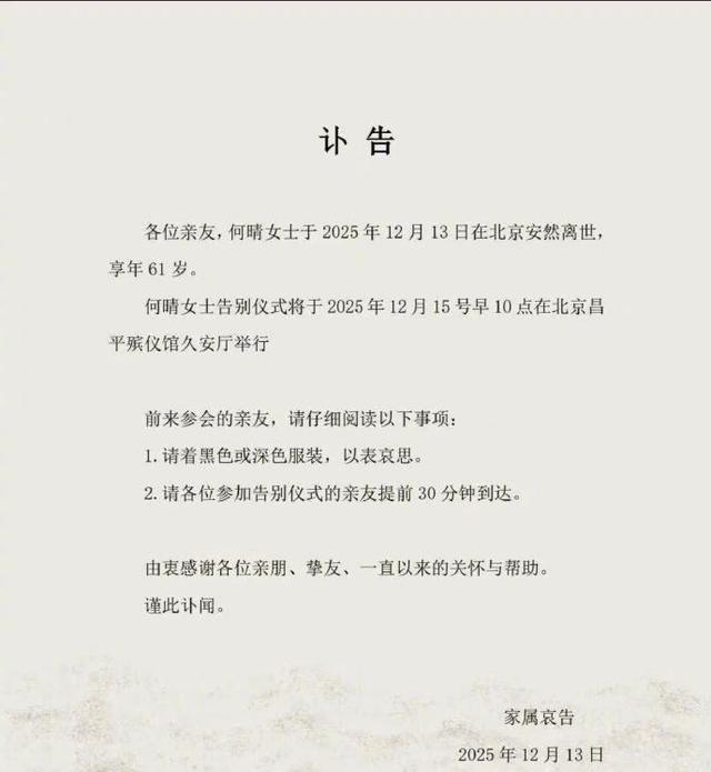 何晴于2025年12月13日在北京离世,享年61岁。家属通过讣告公布这一消息,告别仪式定于2025年12月15日上午在北京昌平殡仪馆举行。消息传出后,多位圈内人士表达悼念,包括出演过经典角色的演员们通过网络或采访方式回应。她的离世与长期健康问题相关,家属在讣告中提及她在北京安然离去,但未详细说明病情细节。相关报道显示,她曾在2015年被诊断出脑部肿瘤,此后经历了手术和恢复过程。